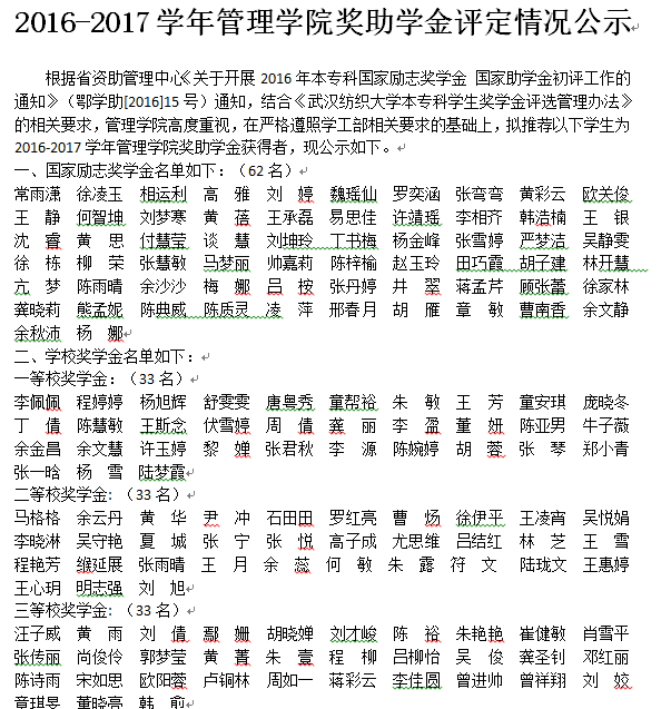 根据省资助管理中心《关于开展2016年本专科国家励志奖学金 国家助学金初评工作的通知》(鄂学助[2016]15号)通知,结合《16877太阳集团安全入口本专科学生奖学金评选管理办法》的相关要求,16877太阳集团安全入口高度重视,在严格遵照学工部相关要求的基础上,拟推荐以下学生为2016-2017学年16877太阳集团安全入口奖助学金获得者,现公示如下。