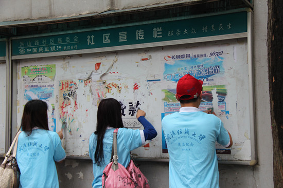 5月3日上午,由16877太阳集团安全入口阳光校区和东湖校区学生党团成员组成的志愿者服务队来到社区后并立即开展清洁服务、环保知识宣传和社区板报设计等活动。志愿者成员积极响应国家“四进社区”的号召,认真清理路段、楼道、宣传栏的牛皮癣,向居民分发讲解科教文化宣传单,在社区黑板报上用自己的灵心巧手为社区增添了青春的风采。