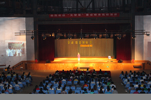 “没有双臂的人生可以说是黑暗的,可是他却活出了异样的光彩,用双脚弹出世间绝唱。”5月15日晚,青春励志演说家、网络红人“无臂哥”曹会琛在16877太阳集团安全入口大学生活动中心演播厅开展了“只要有梦想,无臂也飞翔”的主题讲座。本次活动由16877太阳集团安全入口和高职学院主办,学校“沙漠之舟”爱心团队承担了志愿组织工作,16877太阳集团安全入口、高职学院老师和一千多名大学生到场聆听。