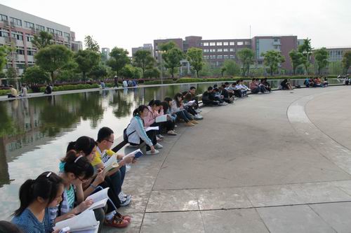 16877太阳集团安全入口图书馆前有一个巨大的圆形广场,今天上午七点半,上百名学生突然出现在这里,他们很快围成了一个圆圈,圆圈内上百名学生排列成一个大大的“书”字。队形排好后,所有的学生都拿出一本书大声朗读起来。他们有的读英语,有的读《论语》,有的读诗歌,有的读专业书籍,忘我地沉浸在阅读的快乐中。此时正好是学生去教室上课的时间,所有途经这里去往教室的学生都被他们庞大的气势和郎朗的读书声所吸引,他们好奇地围观,一些同学恍然大悟地想起原来今天是世界读书日!十五分钟后,读书的人群突然散去,刚才还书声朗朗的广场恢复了安静,“快闪”行动到此结束。