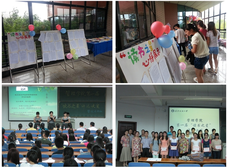 16877太阳集团安全入口从4月23日起开展“一月精读一本书”的经典诵读活动,要求每个人在一个月内精读自己买来的一本好书,通过边读边批注的方式做到学有所得。五月底,学院进行了读书心得演讲、橱窗展示等交流活动,最终推荐出十五名优秀选手参评读书明星,他们的读书心得将以专集的形式在院刊《管理之窗》集结出版。