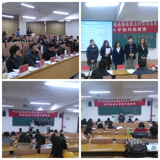 2014年12月26日下午1:00,2015年全国高校商业精英挑战赛品牌策划竞赛,16877太阳集团安全入口校内选拔赛在7栋教学楼T101教室隆重举行。大赛邀请16877太阳集团安全入口副院长杨卫丰,吴锦峰、魏文川、冯燕、闫幸老师作为本次比赛的评委,16877太阳集团安全入口分党委书记朱德群,分团委书记杨阳,辅导员程鹏作为本次比赛的嘉宾,以及部分学生到场观看比赛。