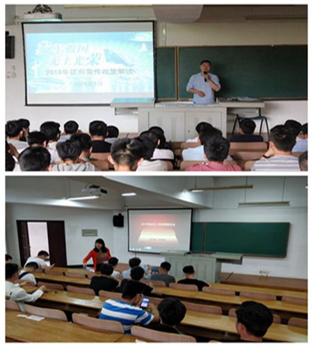 为做好2018年太阳官网大学生应征入伍工作,增强大学生投身国防的意识,增进对军队建设及征兵政策的了解。5月10日下午14:00,16877太阳集团安全入口2018年征兵工作动员会在7-T101教室与7-T102教室举行。