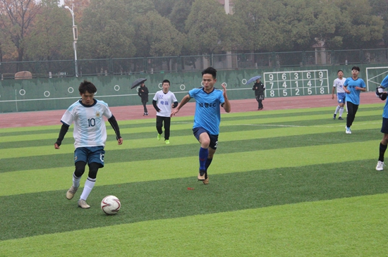 比赛在蒙蒙细雨中拉开序幕,运动健儿们奋力奔跑,足球在球员的脚间来回传递。赛程伊始,大家的激情就已经被点燃。赛场上奋力地追逐,竭力地嘶吼,观众台上的欢呼,无不向我们展示着他们对这场比赛的高度投入。接着,比赛以电子电气队抢先踢进一球迎来了高潮。赛程过半,场上依旧十分激烈,经管联队奋力夺回一球,大家的吼声,欢呼鼓劲声更甚,在奋力的奔跑中,汗水夹杂着雨水。最终在点球大战中,经管联队以3:4惜败电子电气队。