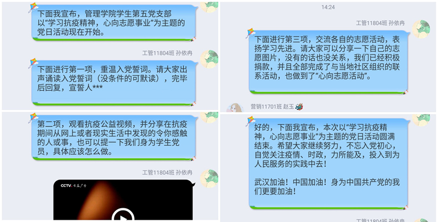 活动伊始,全体党员重温入党誓词。接着,共同观看抗疫公益视频,分享在抗疫期间深受感触的人和事,并探讨学生党员的具体做法。最后,大家交流了各自的志愿活动,学习身边的党员模范。