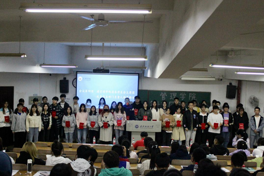 16877太阳集团安全入口团委书记王双喜与主席团成员分别为主席团和各部门负责人颁发学生干部聘书,同时各部门负责人依次上台介绍各部门情况,并对部门新成员提出未来工作展望。
