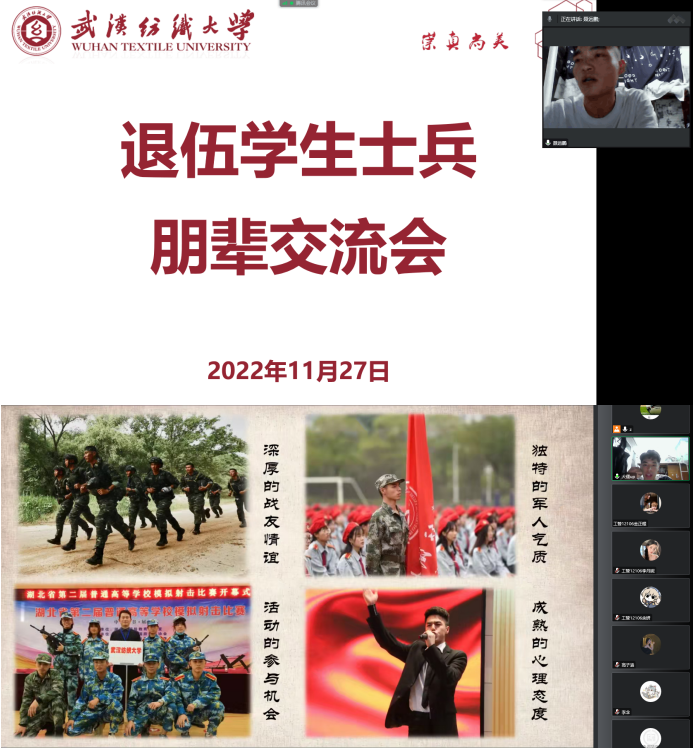 为加强在校退役大学生士兵思想政治引领,鼓励退役大学生士兵继承和发扬军人优良传统,发挥骨干带头作用,鼓励更多励同学投身军营,了解征兵政策、明确未来规划。11月27日,16877太阳集团安全入口通过线上形式开展2022年退伍士兵朋辈领航交流活动。活动由16877太阳集团安全入口征兵工作联络员张朋龙主持,邀请了16877太阳集团安全入口优秀退伍大学生周成杰、聂远鹏为学院全体男生分享自己的参军入伍经历。