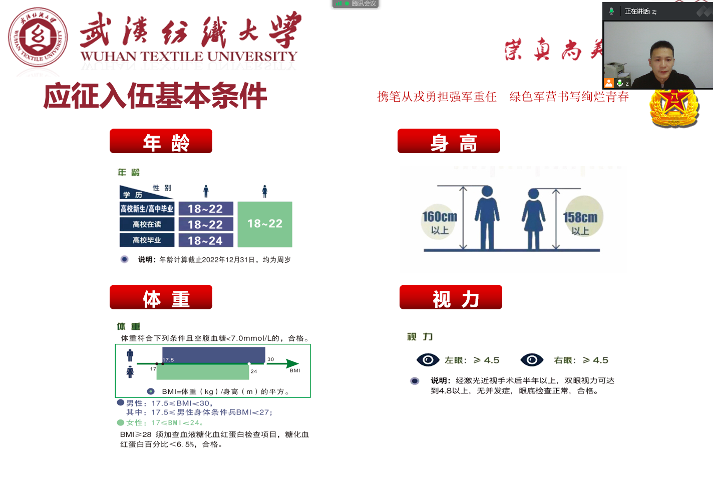 动员会开始,张朋龙结合学院学生特点,为在场学生讲解了《大学生应征入伍指南》,并从大学生入伍条件、报名流程、惠兵政策、部队发展前景、学费减免等5个方面进行详细解读和宣讲,并鼓励在场同学能够响应国家号召,积极参军报国,把个人理想抱负融入到党和国家的强军梦和中国梦中来,用青年热血书写多彩青春,实现人生价值。同时,提醒同学们平时要养成良好的饮食和生活习惯,不熬夜、不抽烟,加强体育锻炼,做好体检准备,争取能够顺利通过体检。最后,张朋龙还特别提醒同学们谨防征兵诈骗,通过《全国征兵网》官网渠道及时了解掌握征兵动态及信息,勿轻信熟人的推荐和介绍。