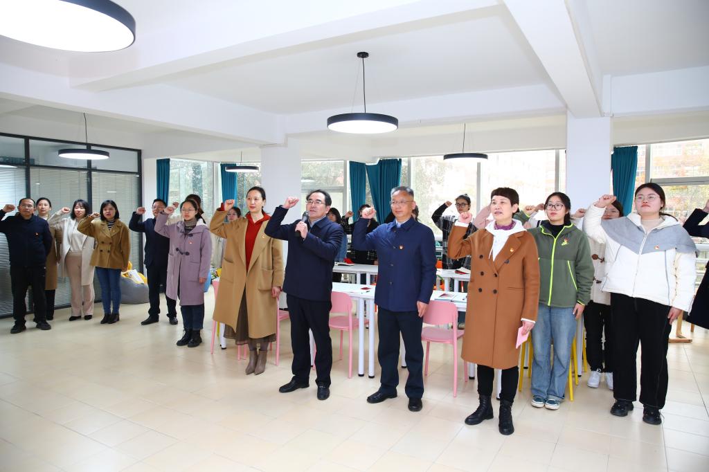 仪式上,滕胜娟介绍了“蓝茑轩”一站式学生社区服务中心的筹建情况、成立背景、中心建设及未来打算。田辉玉、罗锦银、滕胜娟、吴金红共同为“蓝茑轩”一站式学生社区服务中心揭牌。随后,在场师生共同参加“蓝茑轩”一站式学生服务中心启动后的首场主题党日活动。田辉玉带领全体党员重温入党誓词,与在场学生亲切互动,提出希望学生社区中心发挥平台作用,坚持以党建工作为引领,探索“党建+”社区育人体系,让党组织的神经末梢连接到每个楼栋、宿舍。